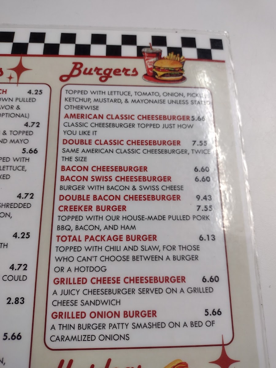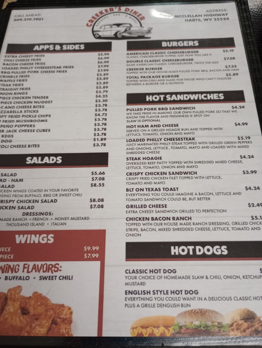 If you're looking for a cozy spot to enjoy a hearty meal, the Creekers' Diner Menu offers a variety of comforting dishes that will satisfy any craving. Located at 1121 McClellan Hwy in Harts, WV, this local gem serves up everything from classic breakfast options to mouthwatering burgers, all made with fresh ingredients. Whether you're in the mood for a classic diner breakfast with eggs and pancakes or something more filling like a juicy steak, Creekers’ has you covered. For those who love a good sandwich, their selection of hearty subs and melt-in-your-mouth grilled sandwiches is perfect. The diner also features daily specials that bring a unique twist to your regular favorites, so there's always something new to try. With a welcoming atmosphere and great food, Creekers' Diner is the perfect place to enjoy a meal with family and friends.
